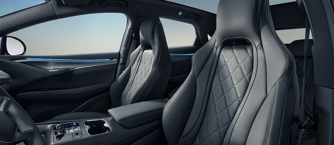 Interior BYD SEALION 7 dirancang dengan sentuhan dinamis, keseimbangan sempurna, dan ruang lapang, menciptakan pengalaman berkendara yang menyatu dan imersif.